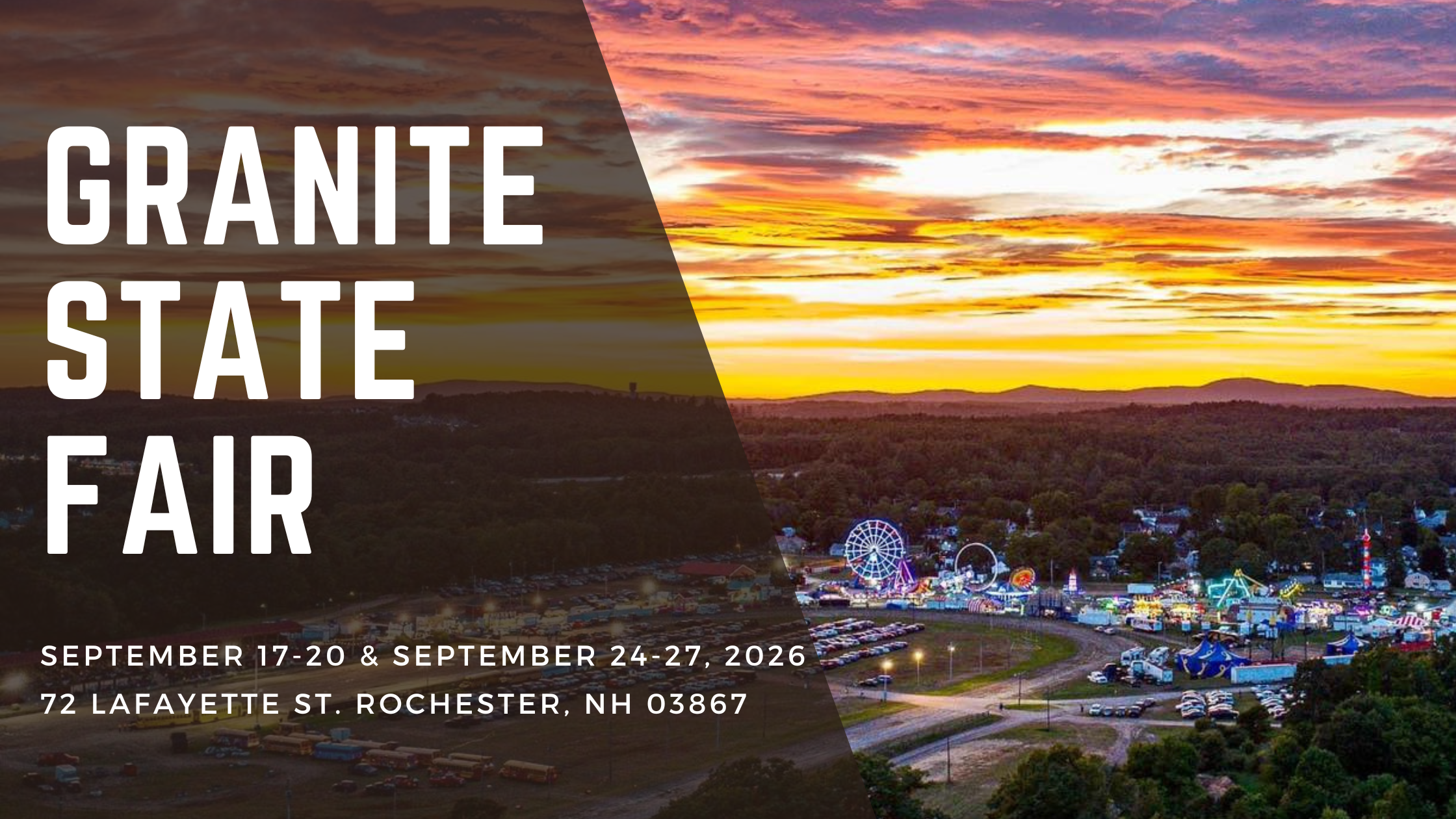 Granite State Fair, originally established as the Rochester State Fair in the 1800s, began as a community initiative to highlight agricultural and mechanical displays. Today, it upholds these traditional exhibits and competitions while expanding to include many modern attractions. Visitors can enjoy a bustling midway with rides, games, food, entertainment, and the unique Circus Hollywood, exclusive to New England. Additional highlights include the thrilling Bus Derby, unique agricultural exhibits, vendors, and exciting activities such as Cornhole tournaments. Come and experience everything the fair has to offer!